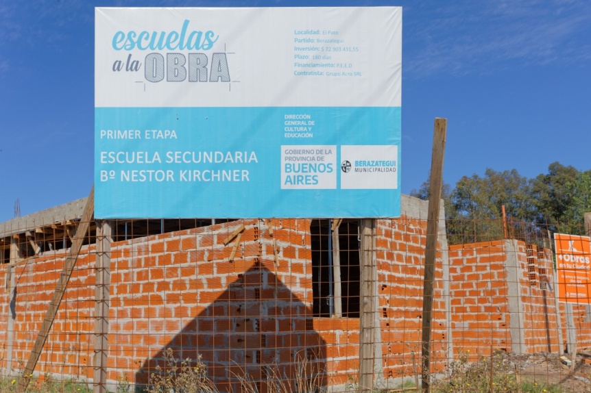 Bajo el programa “Escuelas a la Obra”, la Municipalidad de Berazategui avanzó hasta el 60% en la construcción de dos nuevas Escuelas en la localidad de El Pato, ubicado en la calle 531 y 633, barrio Néstor Kirchner. Se están edificando en terrenos que fueron cedidos por el Municipio y beneficiarán a más de 300 jóvenes de la zona.