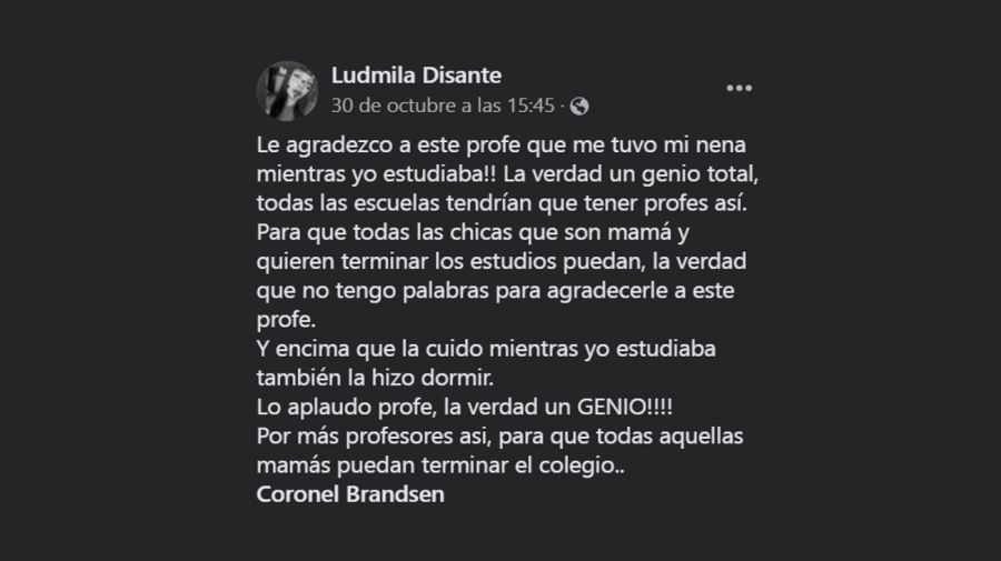 Sin embargo, fueron sus palabras a través de la plataforma de Facebook las que se hicieron eco a través de los medios de comunicación. “¡Le agradezco a este profe que me tuvo a mi nena mientras yo estudiaba! La verdad un genio total», comenzó.