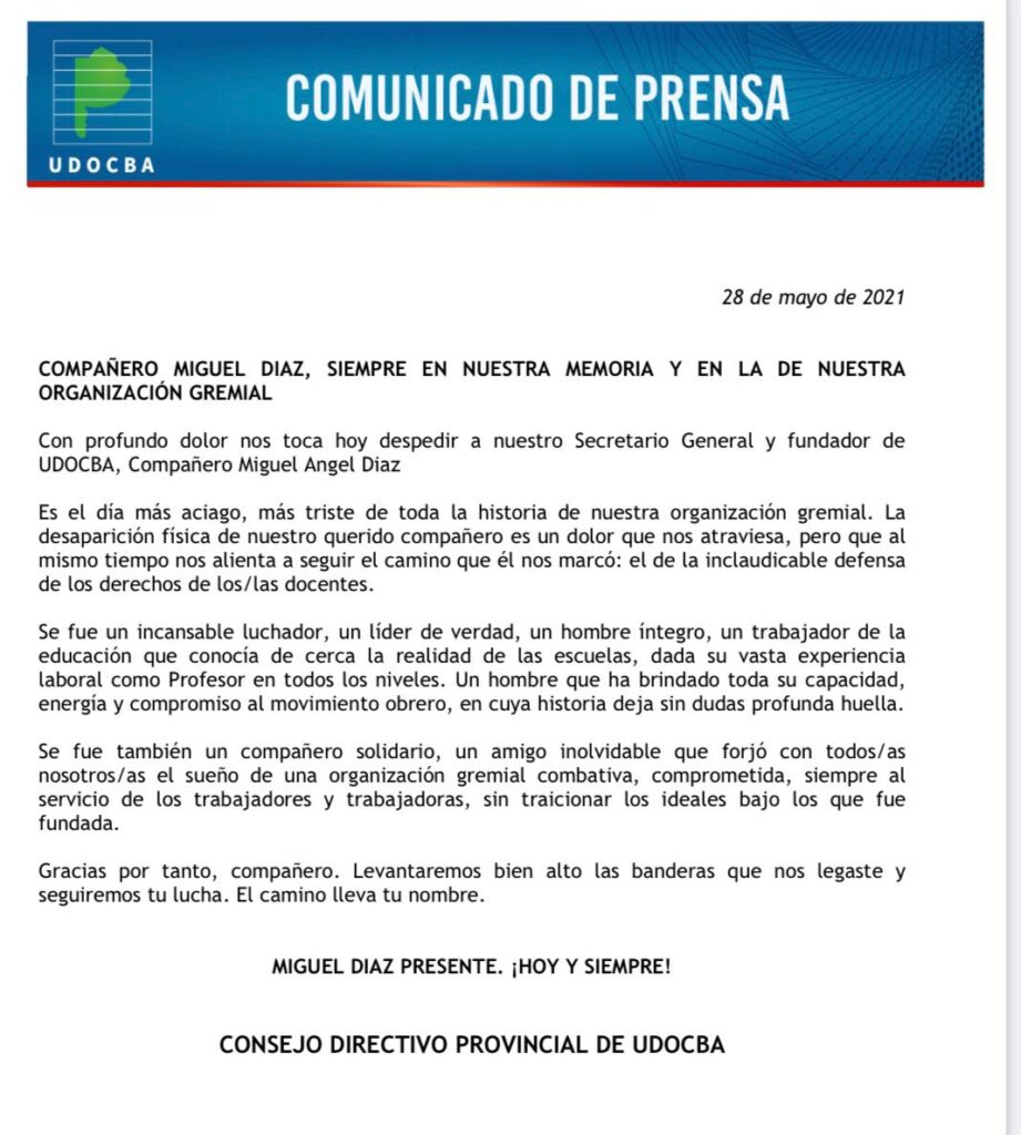 A través de un comunicado de prensa, UDOCBA informó la triste noticia del fallecimiento de Miguel Díaz de 60 años, quien lidiaba contra un cáncer que había deteriorado últimamente su estado de salud, “se fue un incansable luchador, un líder de verdad, un hombre íntegro, un trabajador de la educación que conocía de cerca la realidad de las escuelas, dada su vasta experiencia laboral como Profesor en todos los niveles”.