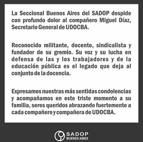 El sindicato docente, SADOP, acompaño a UDOCBA y despidió a través de una publicación en sus redes sociales a Miguel: