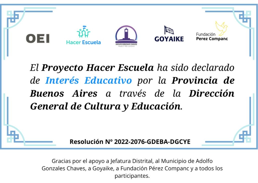 La Dirección General de Cultura y Educación de la provincia de Buenos Aires declaró de interés educativo provincial el proyecto Hacer Escuela, de la Organización de Estados Iberoamericanos para la Ciencia, la Educación y la Cultura (OEI), que se está desarrollando en el distrito de Adolfo Gonzales Chaves.