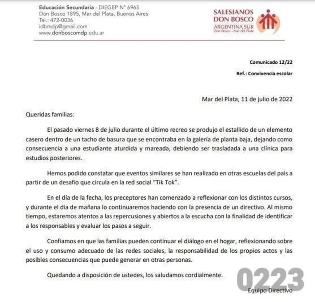 Hasta el día de hoy, el colegio aún no logró identificar a los autores del challenge de TikTok, donde utilizan una botella y mezclan productos para generar una reacción química. En ese sentido, planteó: “Las autoridades me dicen que no saben nada, que si ha sido una sola persona o, si fueron varios, que han hecho un pacto de silencio; incluso puede ser que las mismas familias los estén cubriendo. Vi tantas irregularidades que me permito desconfiar que no lo sepan”. La UFI N°11 de Mar del Plata tomó intervención en la causa.