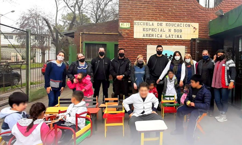 La donación fue de 10 sillas y mesas de maderas, las que fueron producidas en los talleres de carpintería de la Unidad 15 del Servicio Penitenciario Bonaerense, en el marco del programa “Más Trabajo, menos Reincidencia”, impulsado por el Ministerio de Justicia y Derechos Humanos de la provincia de Buenos Aires. Además, se sumó una repisa vertical para huerta y la restauración de una calesita, se efectuó en la entidad escolar de ruta 88 y calle 35 bis, donde asisten 30 alumnos y alumnas.