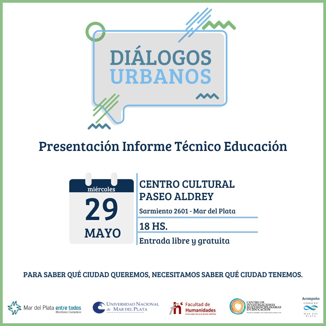 El día miércoles 29 de mayo a las 18 hs. en el Centro Cultural Paseo Aldrey (Sarmiento 2601), la Red Mar del Plata “Entre Todos” junto con la Universidad Nacional de Mar del Plata (UNMDP), la Facultad de Humanidades de la UNMDP y el Centro de Investigaciones Multidisciplinarias en Educación (CIMED), con el acompañamiento del CONICET Mar del Plata, realizarán la presentación del Informe Técnico sobre Educación.