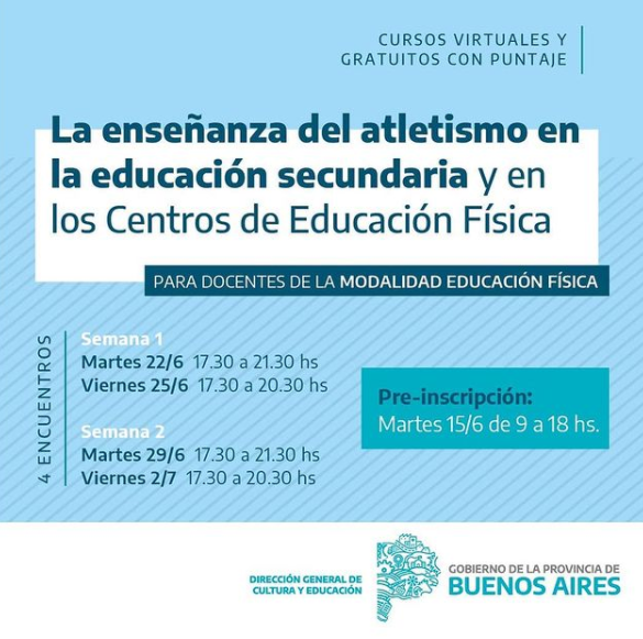 La cuenta oficial de la Dirección General de Cultura y Educación de la Provincia de Buenos Aires, publicó la inscripción del curso “La enseñanza del atletismo en la educación secundaria y en los Centros de Educación Física”. Este martes 15, de 9 a 18 horas, podrás ingresar al formulario para formar parte.