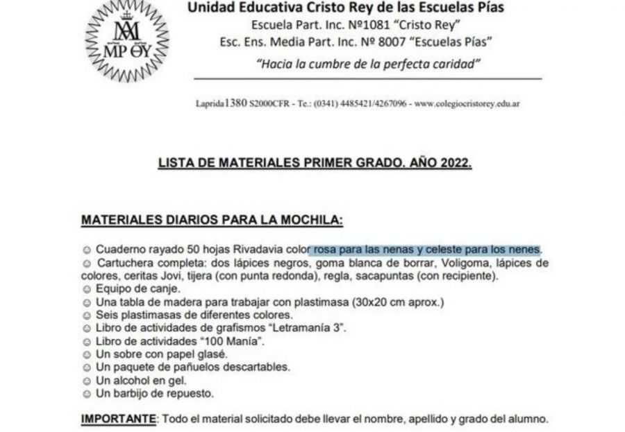 Una lista de materiales escolares se viralizó en las redes sociales, se trata de la escuela rosarina Cristo Rey, que generó polémica en las últimas horas por pedir cuaderno rosa para nenas y celeste para nenes de primer grado.