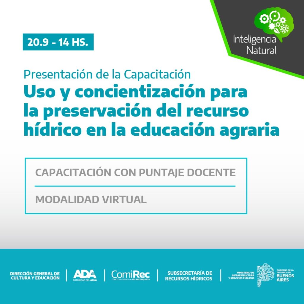 Desde el lunes 20 de septiembre comienza la capacitación “Uso y concientización para la preservación del recurso hídrico en la Educación Agraria”, destinada a docentes que tienen a cargo el campo de formación de las prácticas profesionalizantes de 6° y 7° año, correspondiente a la Tecnicatura en “Producción Agropecuaria”, en escuelas agrarias de la provincia de Buenos Aires.